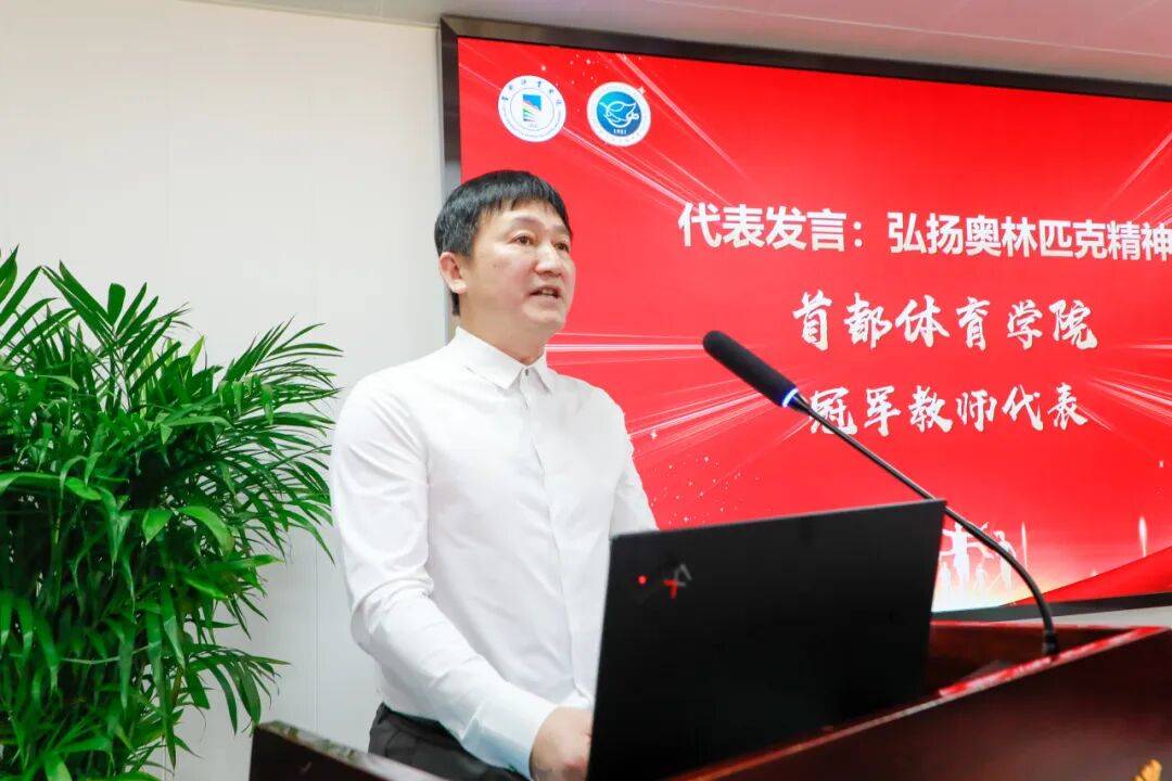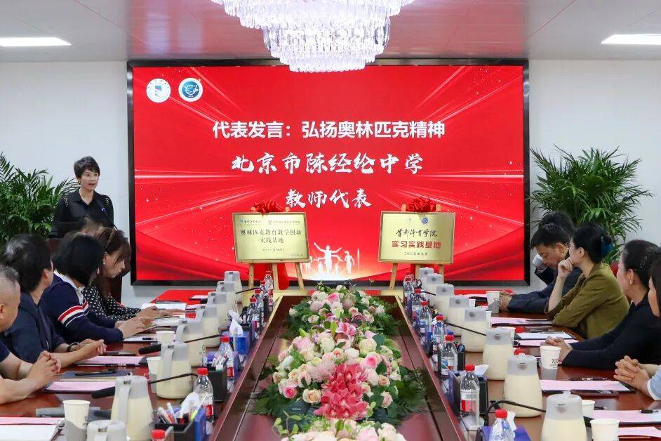 揭牌仪式后,首都体育学院冠军教师代表、武术与表演学院副教授赵庆建作了分享发言。作为2008年北京奥运会武术项目冠军,他结合自身经历阐述了中华武术与奥林匹克运动的共通之处,并表示将积极参与基地建设,推动奥林匹克精神与体育文化在中学课堂中落地生根。陈经纶中学集团科体艺副主任刘娓楠作为教师代表发言,分享了将奥林匹克价值观融入体育教学实践的体会,表达了全体教师以基地建设为契机,深耕体教融合,广泛传播奥林匹克精神的美好愿望。两位教师的发言相得益彰,展现了双方在弘扬奥林匹克精神上的共识。